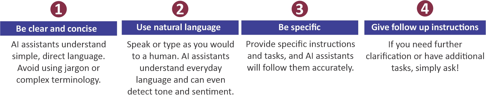 AI assistants understand natural language, so you can communicate with them in the same way you would with a human. Here are some tips to get you started: