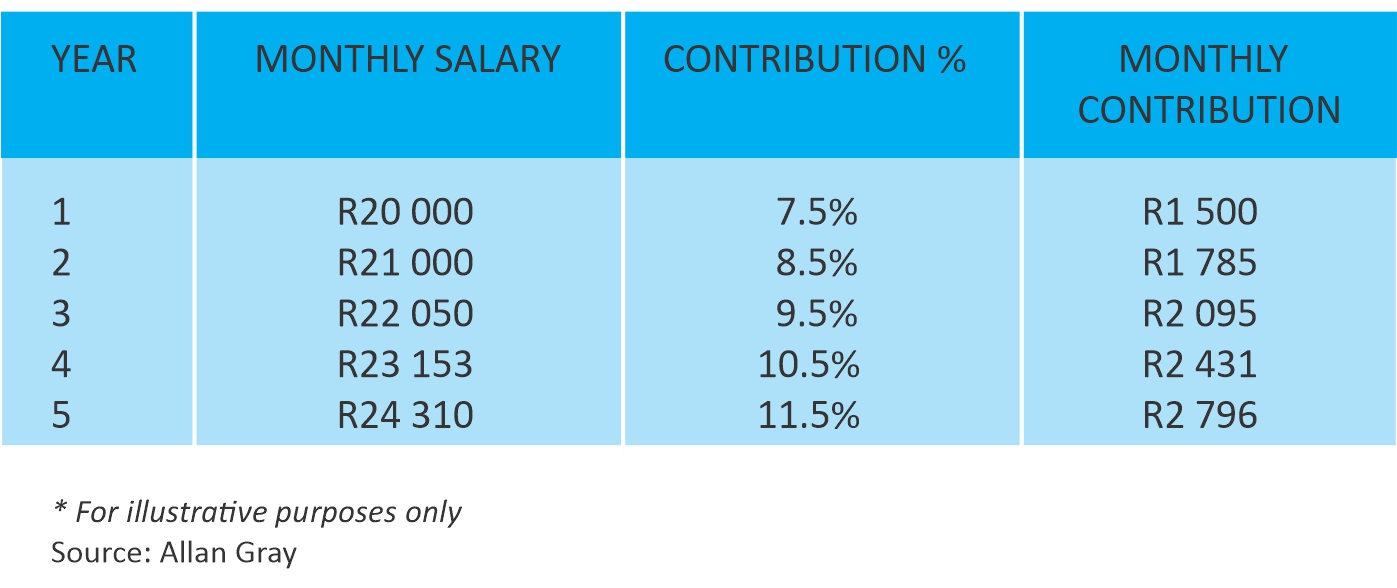 Employers who offer an umbrella fund can consider incorporating a glide path. The glide path, like the SMT strategy, helps members gradually increase their retirement savings contributions over time, using their future salary increases. A glide path is tailored to the requirements of each employer. Below is an example of how this can play out: