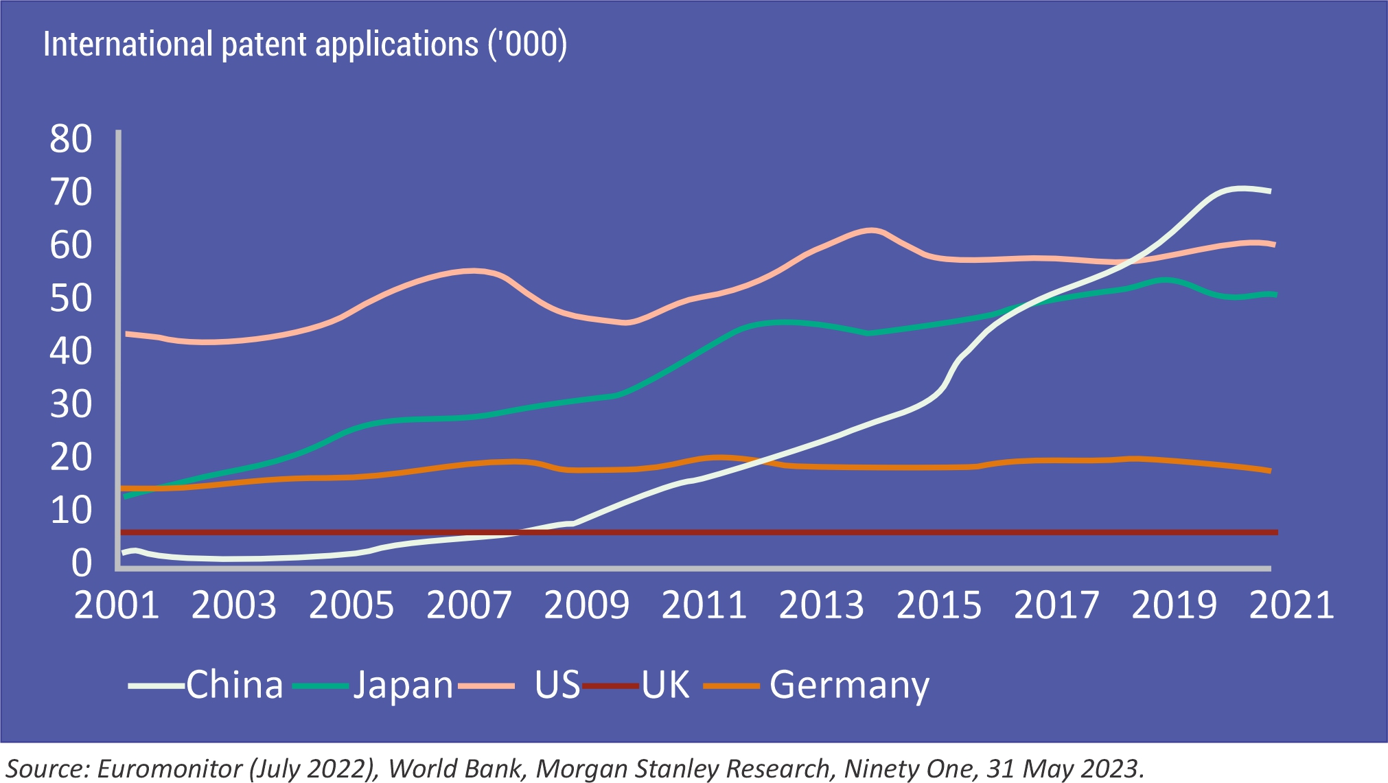 The next growth driver is China’s strong pursuit of technology innovation. Over the last few years, China has played catch up with the major economies in terms of research and development (R&D) spend as a percent of GDP. The country is already spending more on R&D than most European countries, and it leads the world in the number of patent filings. Since 2020, China accounts for about a quarter of global patent applications. The large domestic market and supportive industrial policies provide a favourable background for technology innovation. This is enabling companies to achieve economies of scale and greater efficiencies, allowing them to compete in global markets.