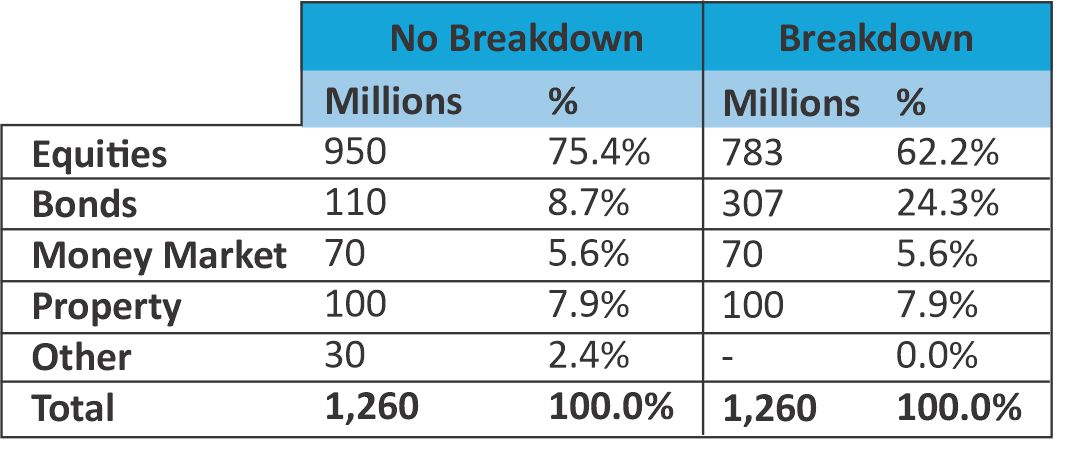 The look through principle prevents wrong conclusions caused by ignoring the make-up of a composite asset. It requires the disclosure of the underlying assets that are the subject of a derivative asset. It breaks down a composite asset into constituents that can then be classified separately. In this way the portion of a derivative asset that is equity related can be aggregated with equities and the bond related portion aggregated with bonds.