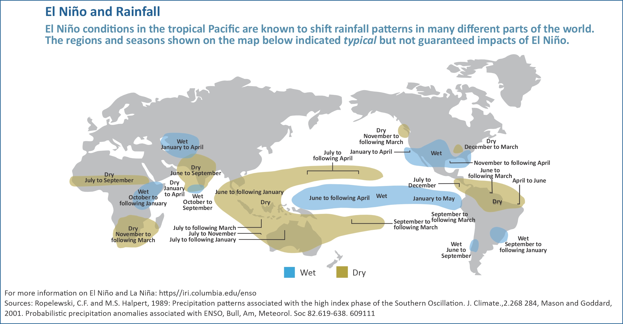 While the impact of El Niño can vary, and much also depends on the strength of the weather pattern, in general it leads to drier conditions in parts of Latin America such as northern Brazil and Colombia, Australia, India and Southern Africa. By contrast, there tends to be greater rainfall in more southerly parts of Latin America, the US and East Africa.