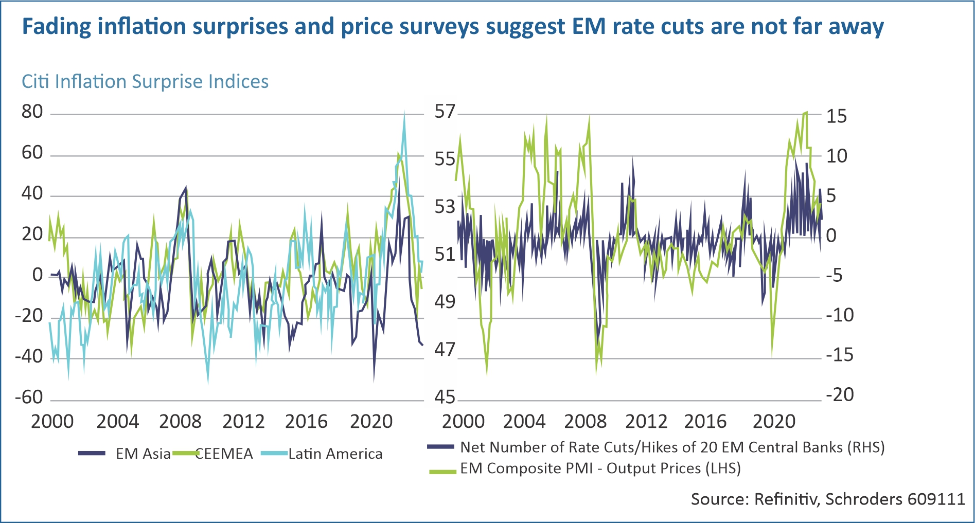 A key plank of our view on emerging markets (EM) is that steep declines in inflation, in part due to a reversal of food price pressures, would allow central banks to start cutting interest rates this year, brightening the outlook for economic growth in 2024.