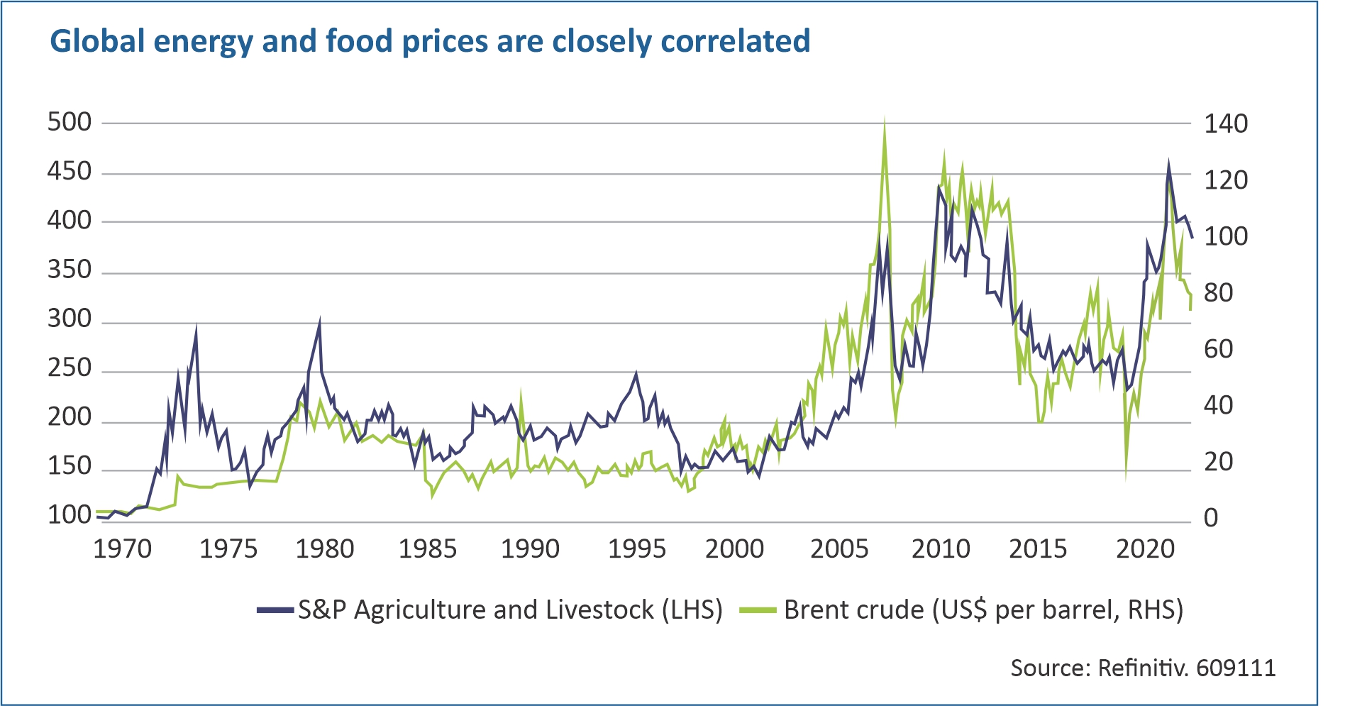 An obvious recent example of this was seen when food prices spiked in the wake of Russia’s invasion of Ukraine. While higher food prices were in part due to concerns about the loss of supply of exports of wheat and other products from the region, much of the impact was due to higher energy prices as sanctions on Russian exports turned the global oil and gas market upside down. That increased the cost of producing food, and also forced up the prices of fertiliser. Energy prices have more recently declined, reflecting downbeat sentiment about the global economic outlook, weighing on food prices.
