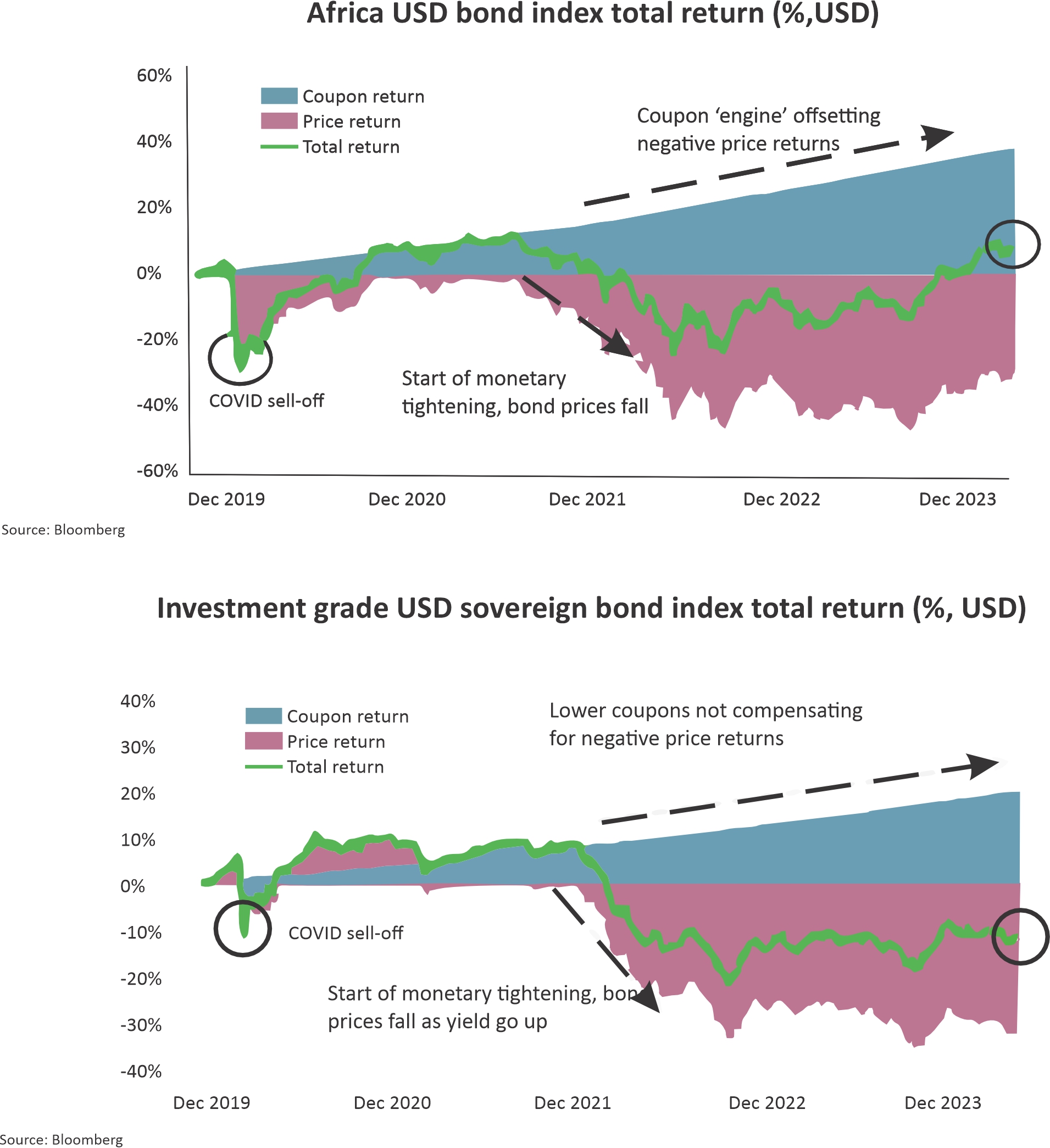 One of the most appealing aspects of high-yield hard currency sovereign debt is what can be described as the "higher coupon engine." This refers to the significant role that higher coupon payments play in driving the investment's overall performance. Unlike lower-yielding bonds, where price appreciation might contribute more significantly to returns, the higher coupons of high-yield bonds provide a steady income stream. This income generation capability is especially valuable in various market conditions, acting as a buffer against volatility and contributing to the total return over time.