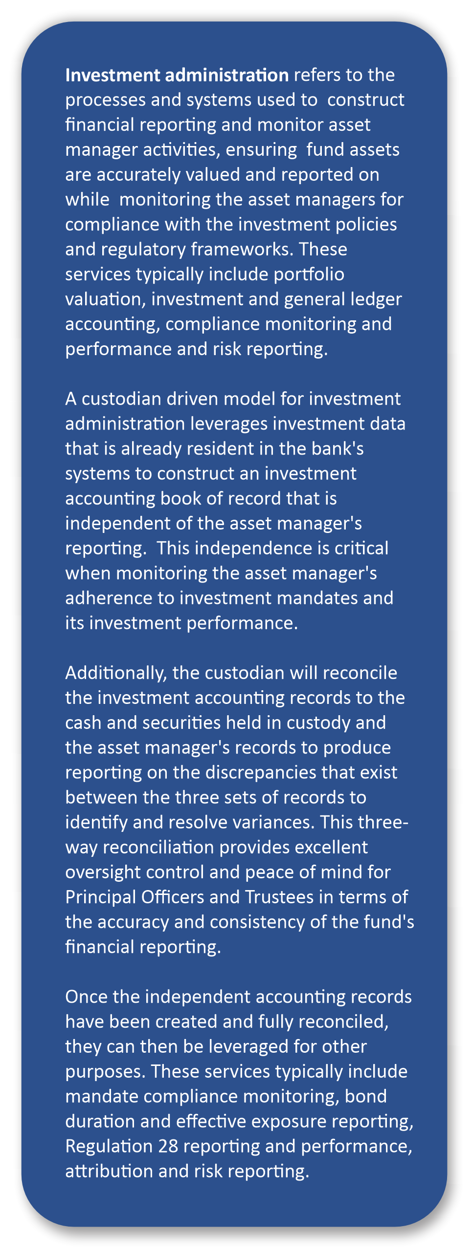 Trends towards an increased focus on fiduciary responsibilities and accountability of retirement fund trustees has led to a greater demand for independence, transparency and fund governance. With their large balance sheets and significant spend on technology, custodian banks are in a great position to meet these demands, providing a secure environment to report and monitor investment portfolios, generate additional income, and preserve capital.