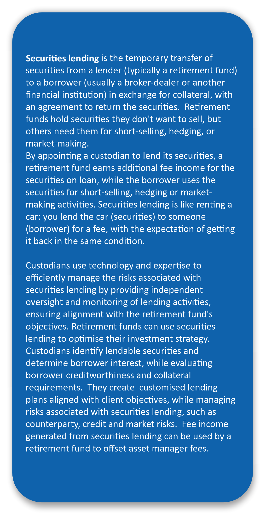“By using a custodian for investment administration, securities lending and transition management, retirement funds can benefit from the bank's economies of scale and risk management frameworks to provide cost effective solutions, which protects and benefits the fund's beneficiaries,” concludes Bateman.