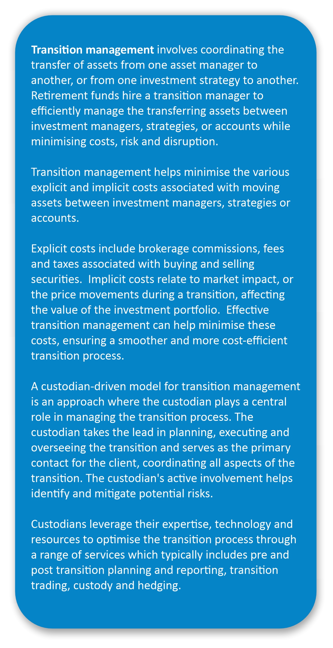 Three areas where custodians have expanded beyond their traditional roles to enhance the value provided to retirement funds include investment administration, securities lending and transition management.