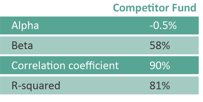• The fund in question was invested in a balanced fund hence the numbers above were reasonable. The fund was not invested entirely in equities but had a significant portion invested in cash and bonds. The portfolio was actively managed and the asset manager was allowed to tactically deviate from the strategic asset allocation. This explains why Beta and R-squared were not 100% and consequently why there was alpha in its performance.