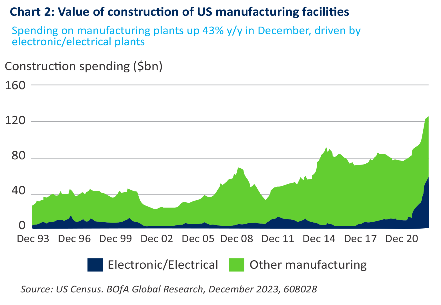 Shortages of semiconductors during the Covid-19 pandemic affected virtually every industry, underlining the importance of having enough capacity. Meanwhile, growing geopolitical tensions are resulting in the US trying to hobble China's access to chip-making technology, hence the focus on domestic production in the Chips Act. This semiconductor reshoring is already appearing in construction data.