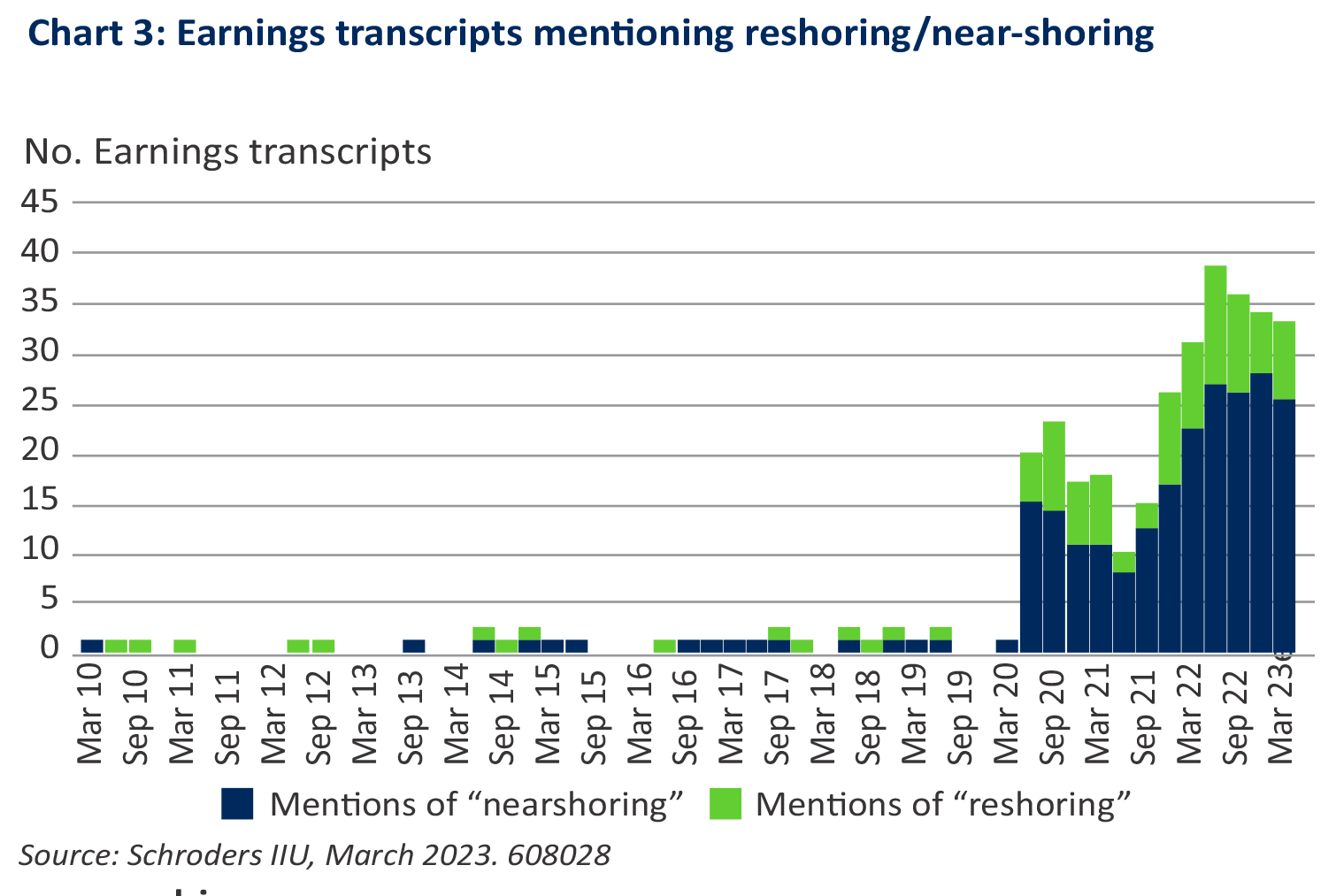 Those who have been tracking mentions of the terms “reshoring” and “near-shoring” in company earnings transcripts in the US would have noticed an uptick in such mentions over the past two years, as can be seen in the following chart.