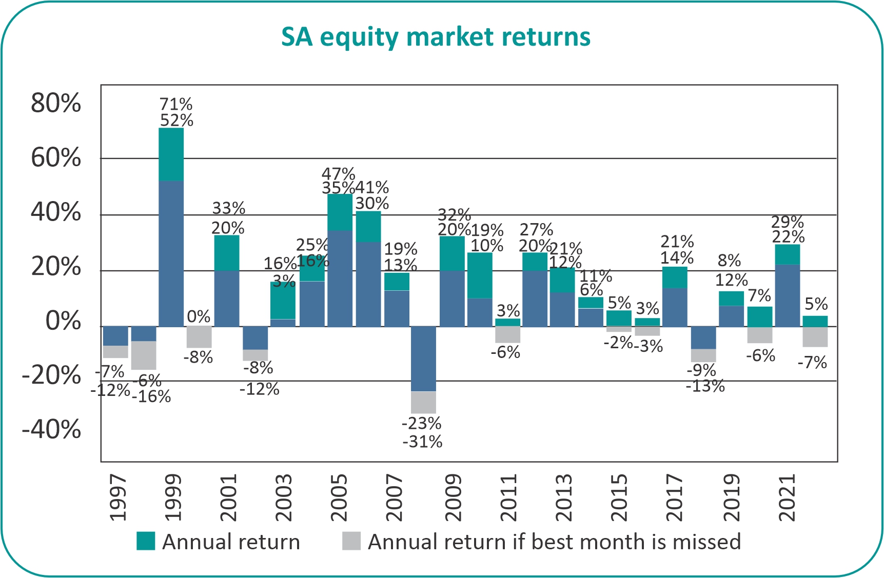 Many South Africans, regardless of their income level, are uncertain about whether their retirement savings will be sufficient for a comfortable retirement. Despite regular reminders from experts and the media about the pitfalls of improper retirement wealth accumulation, approximately 60% of South Africans remain uncertain, according to the Just Retirement Insights Quantitative Research Results of 2022. To boost the chances of long term success, it is crucial to understand the effects of not staying invested, the dangers of emotional decision making, and the trade-offs between risk and return in retirement investing.