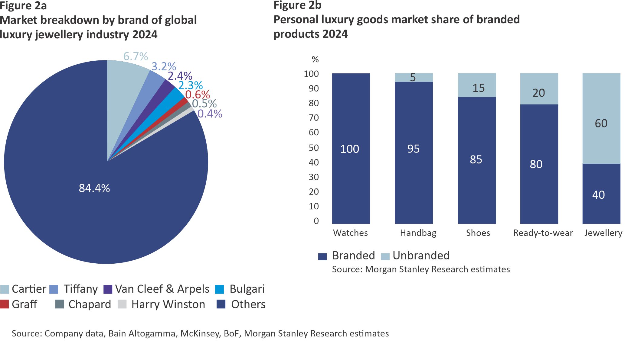 The global jewellery market is substantial, with Euromonitor estimating a total market size – branded and unbranded – of roughly €345 billion in 2024. Relative to other luxury categories such as watches, leather goods, and ready-to-wear, the jewellery category is far more fragmented (Figure 2a). Branded jewellery accounts for only about 40% of global sales, leaving significant room for brands to achieve long-term market share gains driven by premiumisation (Figure 2b).