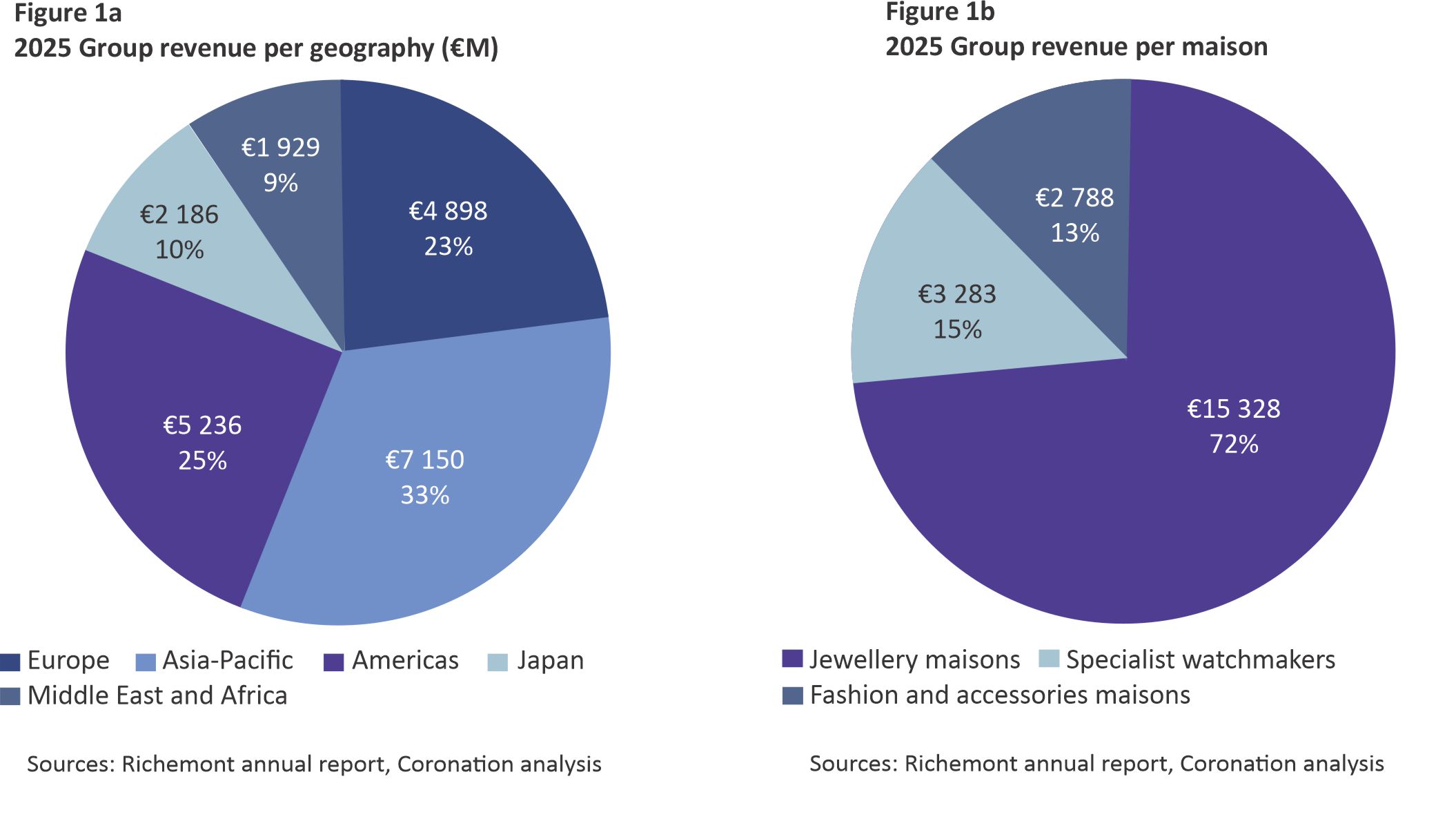 Figure 1a provides the 2025 group revenue split per region. Figure 1b illustrates that, in the same year, its jewellery maisons[1] generated 72% of group revenue, although they delivered 99% of group profits – reinforcing their centrality to Richemont's value creation. Cartier and Van Cleef & Arpels anchor the group's leadership in the branded jewellery segment.