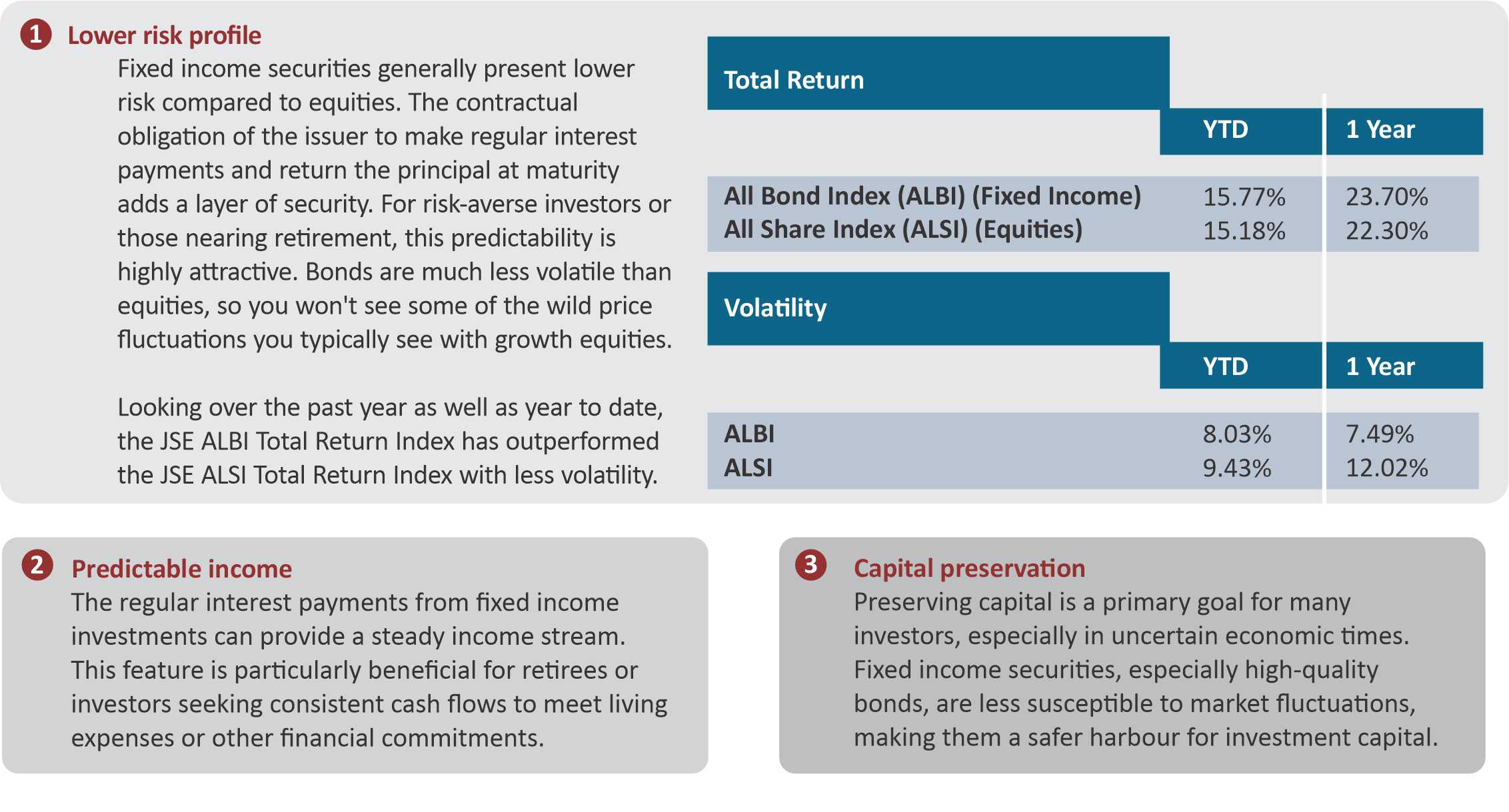 Fixed income assets play a crucial role in diversifying portfolios and mitigating fund risk and volatility. As interest rates fall, stock markets may experience volatility—either due to changes in investor expectations or economic uncertainty. In such times, the relatively predictable nature of fixed income securities provides some stability. Government bonds in particular are considered lower risk compared to equities. They act as a hedge, balancing out portfolio performance during market turbulence and protects overall value.